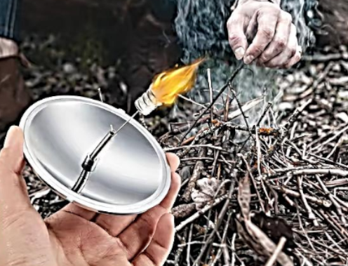 An einer im Brennpunkt des Hohlspiegels befindlichen Halterung lässt im Sonnenschein sich Papier, Heu oder anderes brennbares Material entzünden.